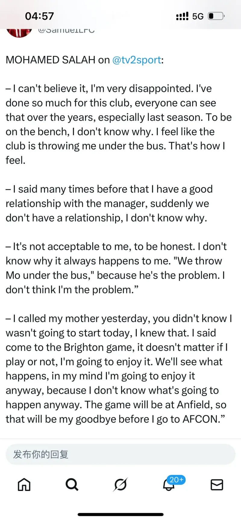 真就和曼联7号一样呗,外网英文社区看了一圈基本没人站Mo的,即使斯洛特再有不是,你自己把更衣室爆了未免也太自私了,这下芬威都不用纠结斯洛特法老二选一了,非洲杯过后估计得走了