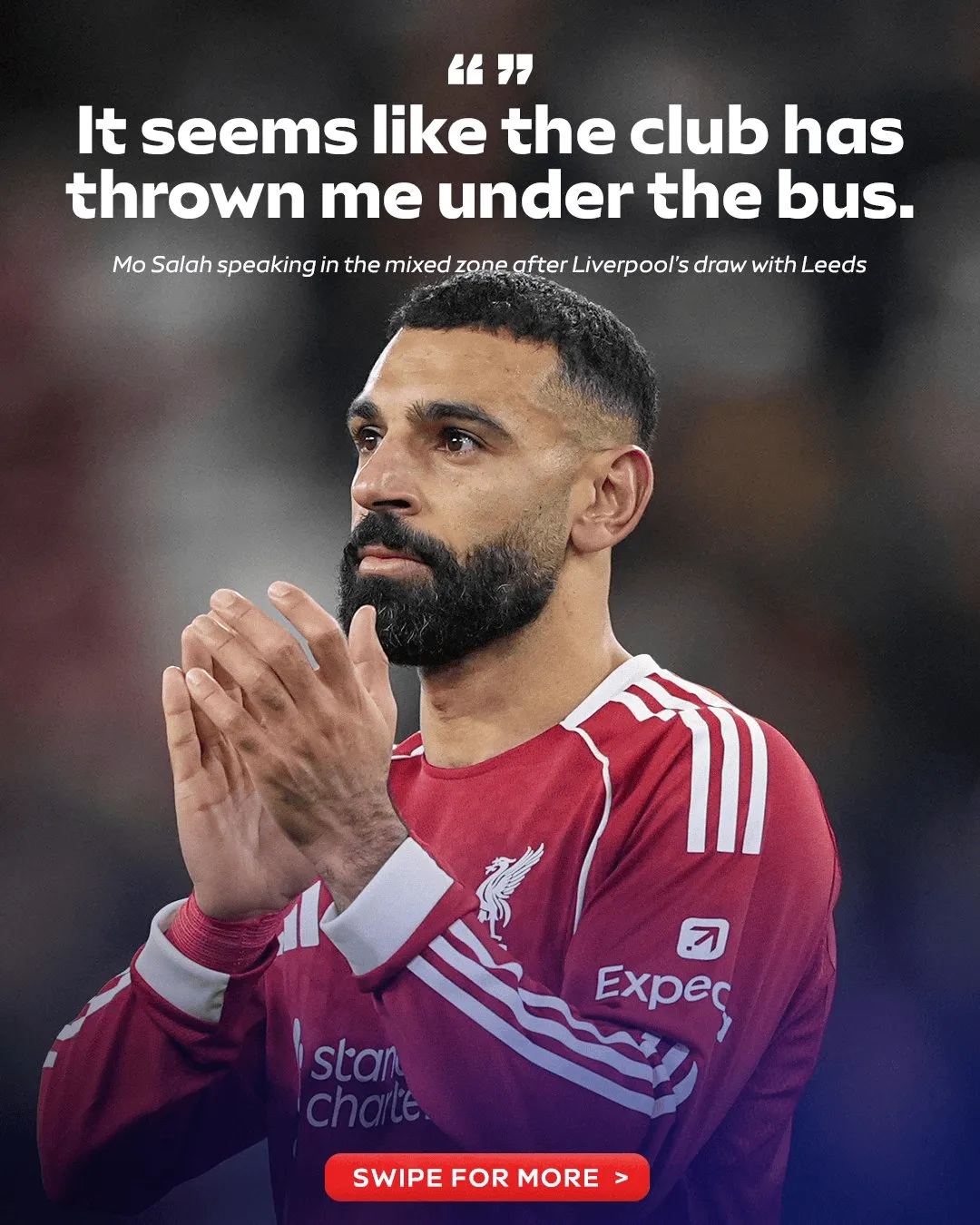 虎扑12月07日讯 利物浦3-3战平利兹联的赛后,萨拉赫在采访中进行爆炸性发言,并暗示对阵布莱顿可能是自己利物浦生涯的最后一场比赛。