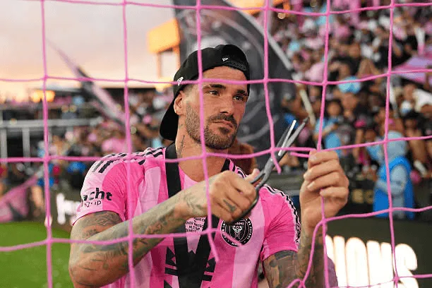 赛后,德保罗也用剪刀剪下了迈阿密主场球门的球网,用以收藏留念。