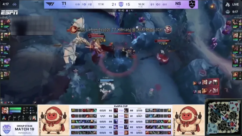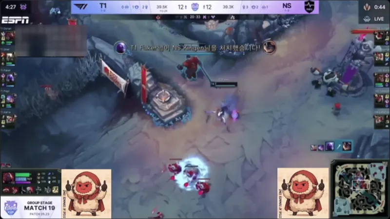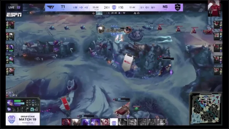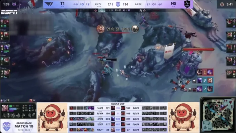 比赛第20分钟,两队在河道爆发混战,T1抓到机会打出1换4大胜逆转前期劣势。
