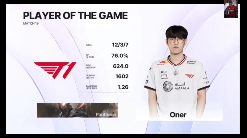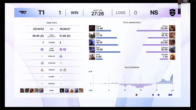 比赛第26分钟,Oner潘森砍下三杀,T1一波团灭NS结束比赛。