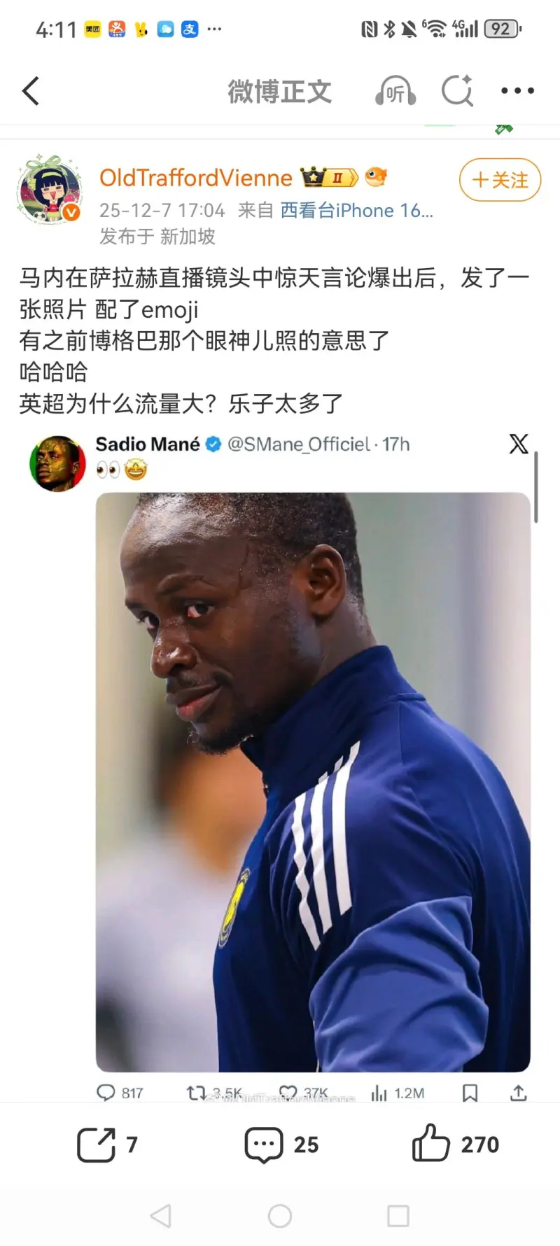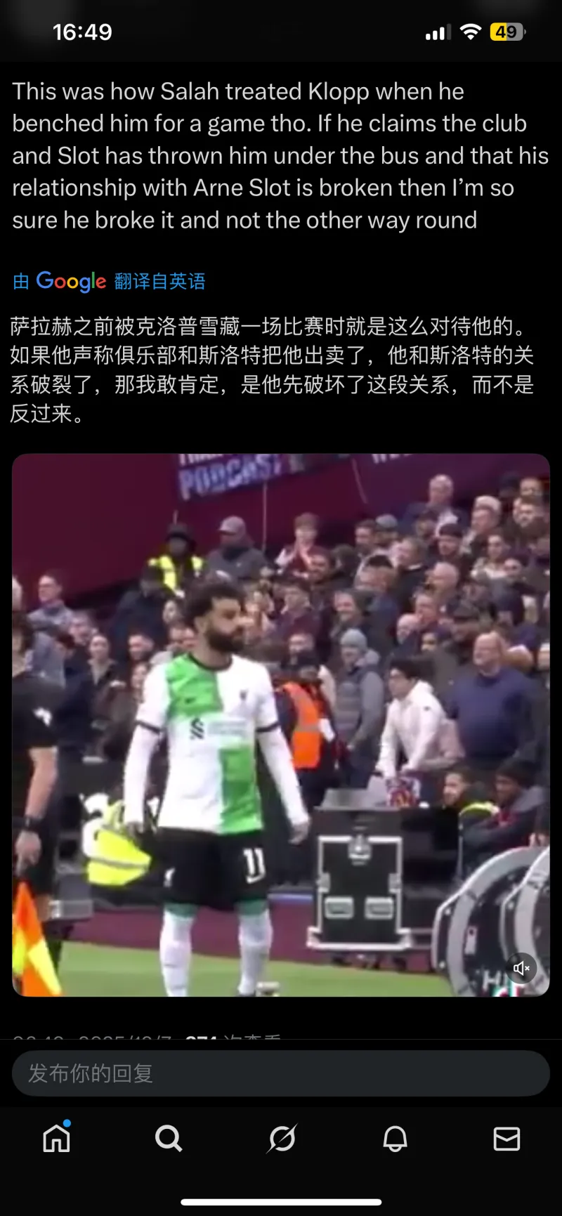 萨拉赫在利物浦更衣室里备受尊敬和爱戴,但他在队内并没有多少亲密的朋友。周五得知自己不会首发对阵利兹联的比赛后,队友们立刻察觉到他的情绪发生了变化。鉴于他以往的言行,他们知道他迟早会公开表达不满,所以当他们在周六深夜看到他的言论时,并没有感到意外。