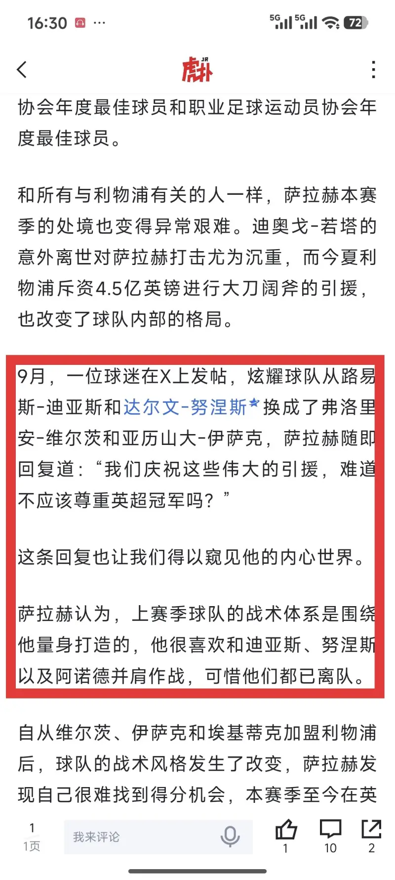 9月,一位球迷在X上发帖,炫耀球队从路易斯-迪亚斯和达尔文-努涅斯换成了弗洛里安-维尔茨和亚历山大-伊萨克,萨拉赫随即回复道:“我们庆祝这些伟大的引援,难道不应该尊重英超冠军吗?”