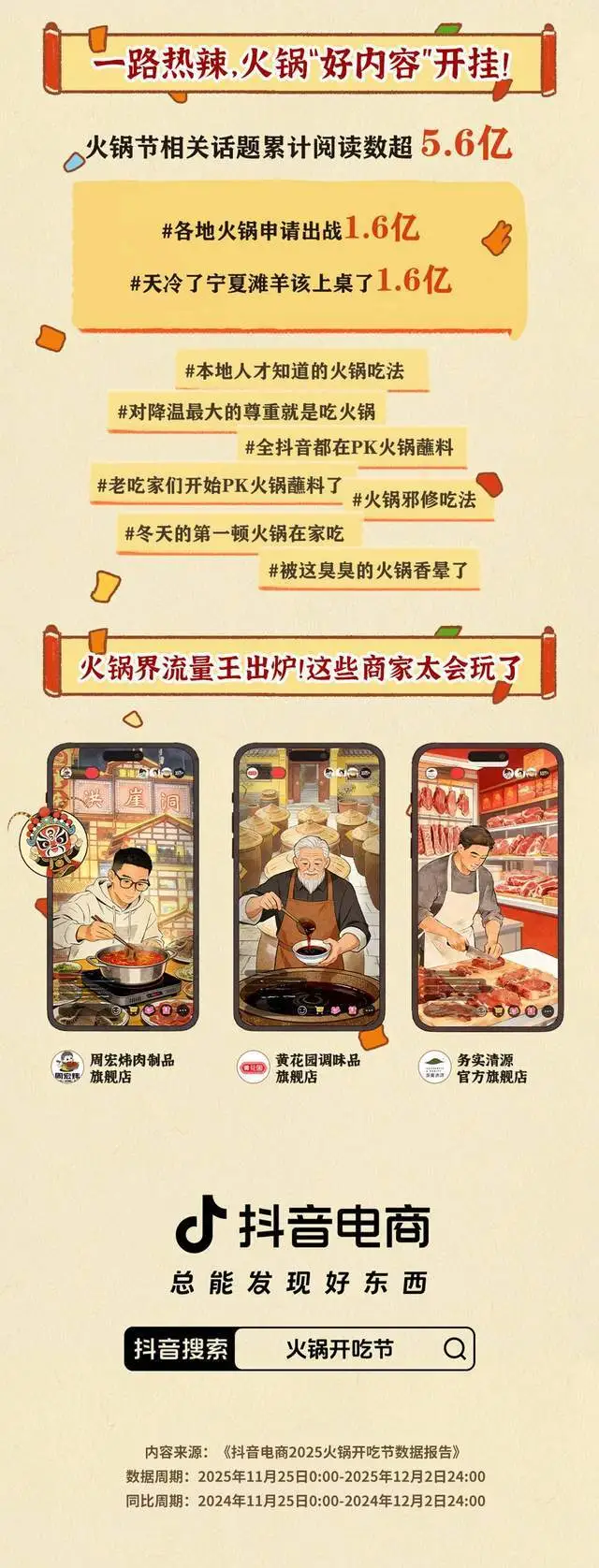 入冬以来,寒意渐浓,一桌热气翻涌的火锅,成了许多人抵御寒意、犒劳味蕾的共同选择。火锅调料、肉蛋海鲜、丸滑蔬菜等火锅相关品类迎来集中爆发。凭借丰富多元、品质可选的货品供给,以及短视频、直播间构成的“云火锅局”,抖音电商正在让天南海北的好食材被更多消费者看见,也帮助火锅相关商家在品牌声量与生意增长上实现双丰收。