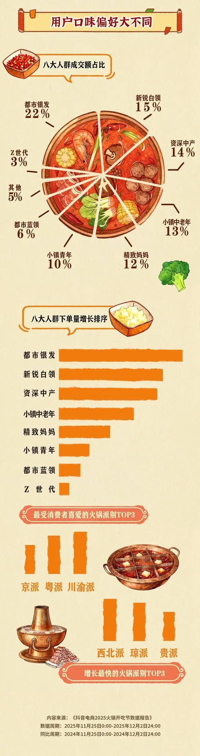 12月8日,抖音电商发布《2025火锅开吃节数据报告》(下称“报告”),通过一组长图集中呈现今年“抖音电商火锅开吃节”的消费亮点与趋势。从平台整体生意规模、不同火锅派别的消费热度,到人群偏好与地域特色,再到独具特色的内容玩法,全景勾勒出一幅冬日火锅消费图鉴。