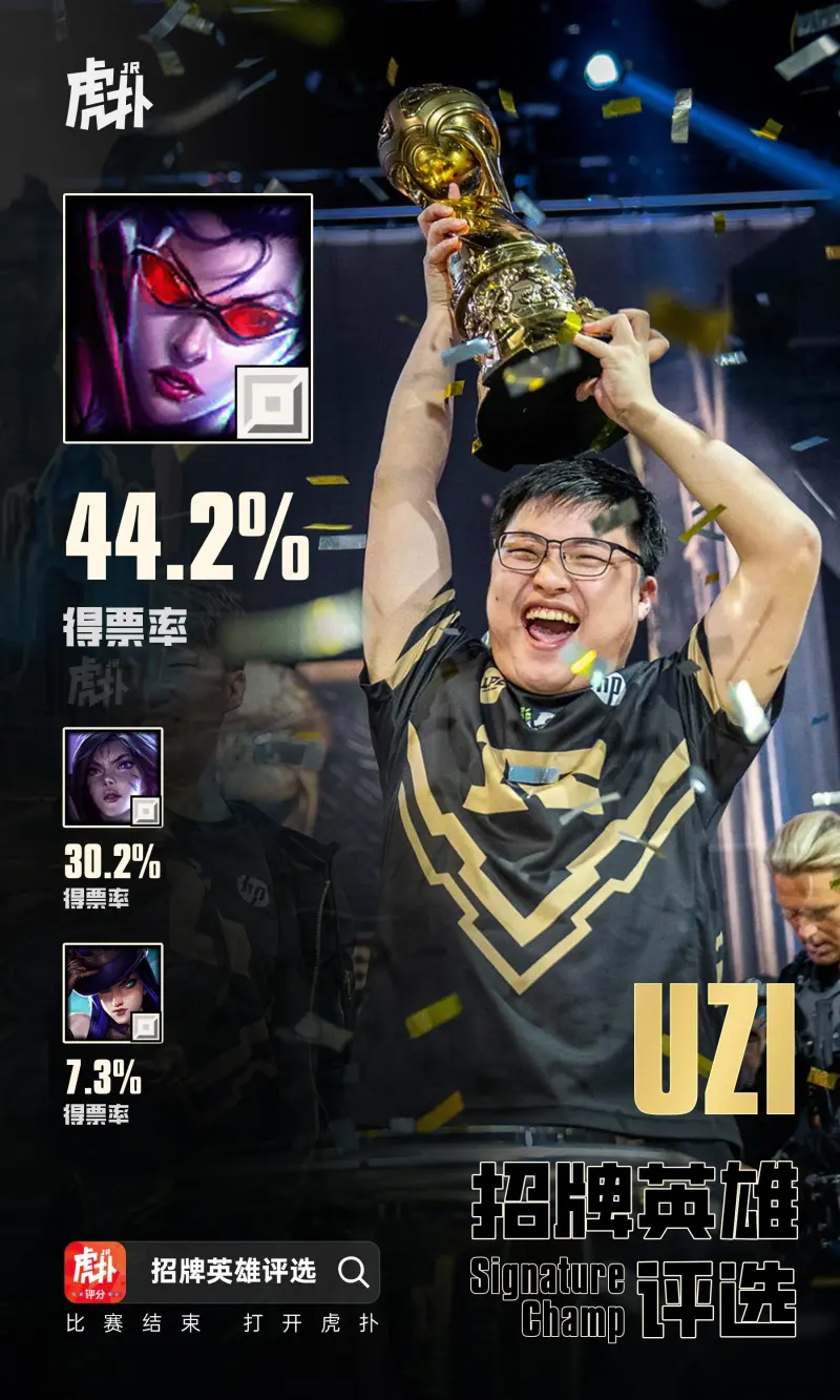 虎扑12月08日讯 经过JRs昨日的评选,薇恩以44.2%得票率当选Uzi招牌英雄。