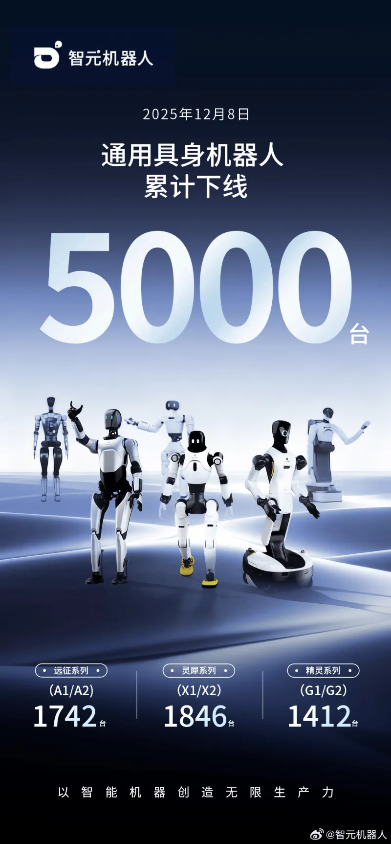 数据显示,智元三大通用具身机器人产品累计出货数据:远征A1/A2累计下线1742台,灵犀X1/X2累计下线1846台,精灵G1/G2累计下线1412台。