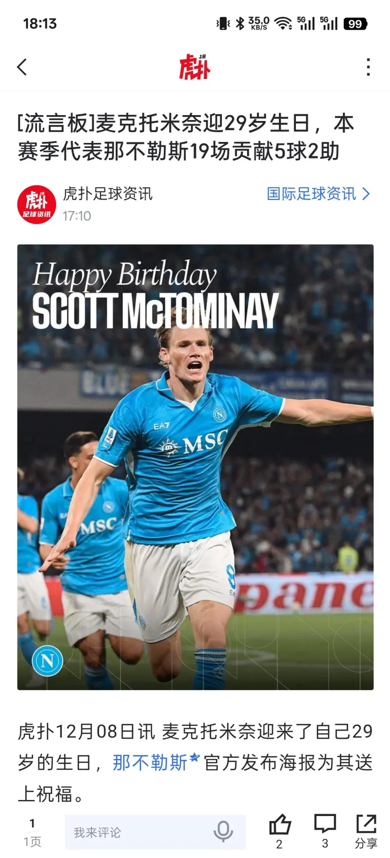 虎扑12月08日讯 麦克托米奈迎来了自己29岁的生日,那不勒斯官方发布海报为其送上祝福。